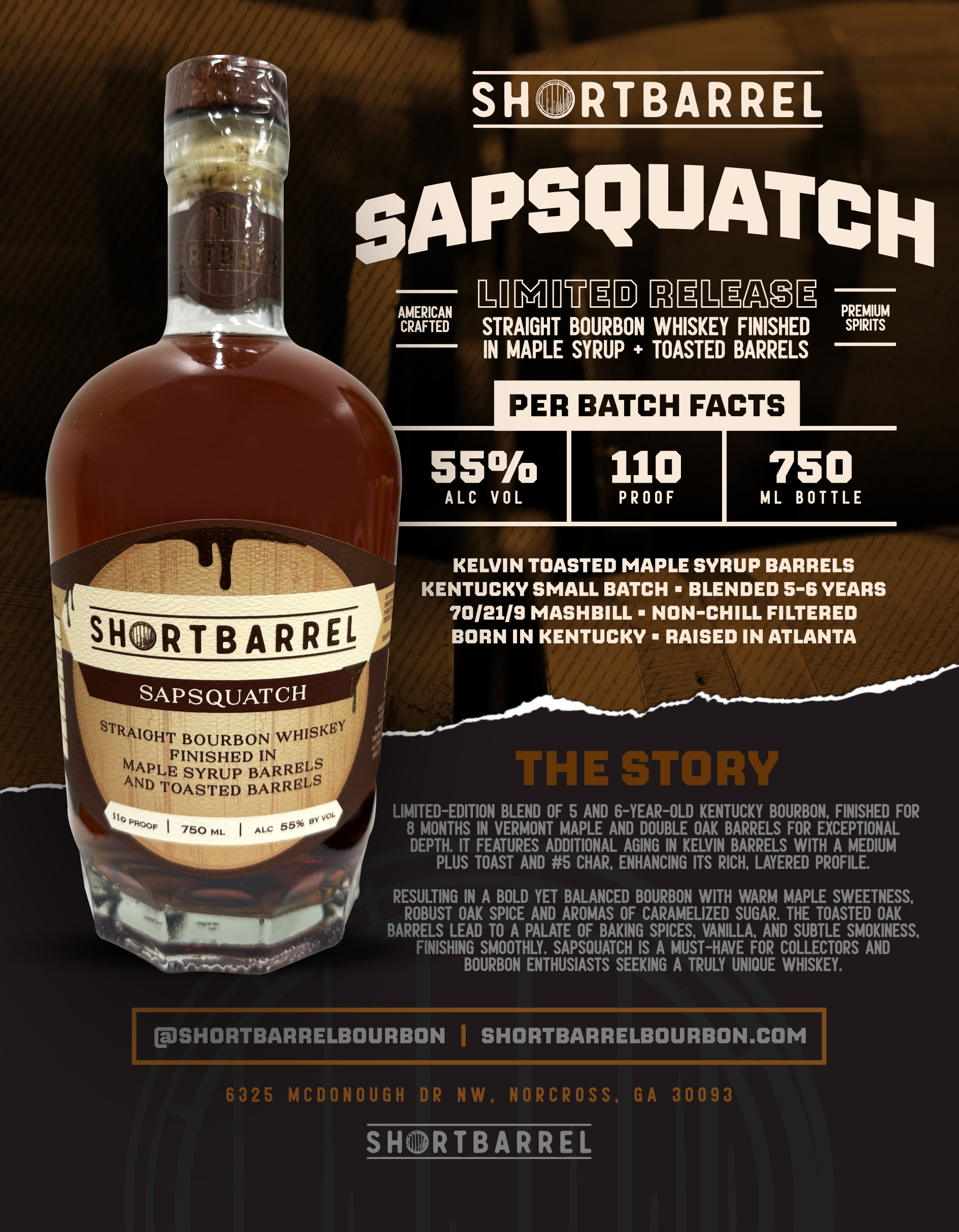 Sasquatch Maple Cask Bourbon is built to express maple through wood contact and barrel aging, not infusion or flavoring.